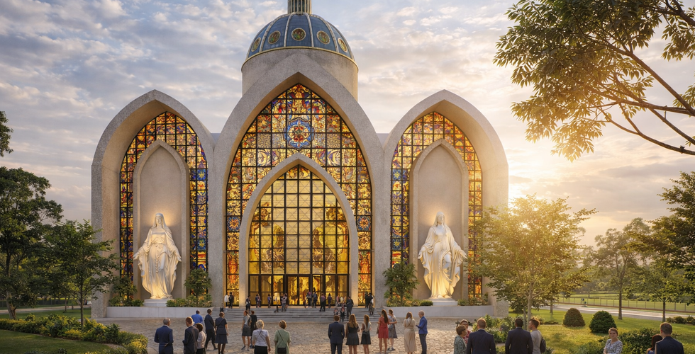 The church design follows a traditional cruciform layout, representing the crucifixion of Jesus Christ. The exterior features a grand façade, with a prominent entrance flanked by towering bell towers, symbolizing the gateway to the divine. The façade includes intricate carvings, stained glass windows, and religious sculptures, depicting biblical scenes or saints.